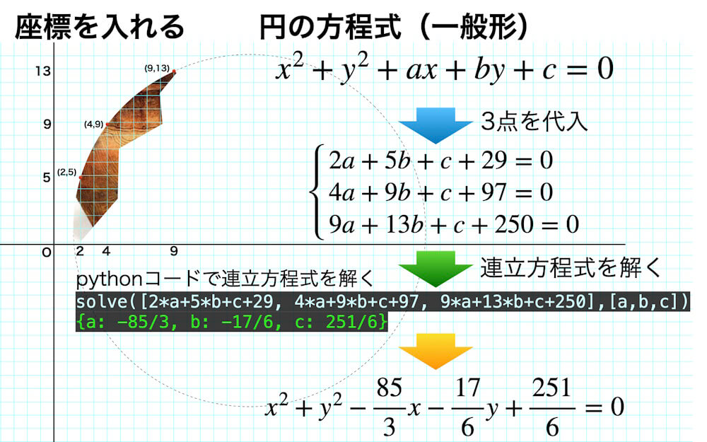 3点として(2,5)、(4,9)、(9,13)を選ぶことができます。この3点を円の方程式(一般形)に代入すれば、未定係数a、b、cについての連立方程式ができあがります。見てわかるように格子点を選んだので、係数が整数なので手計算で連立方程式は解けます。