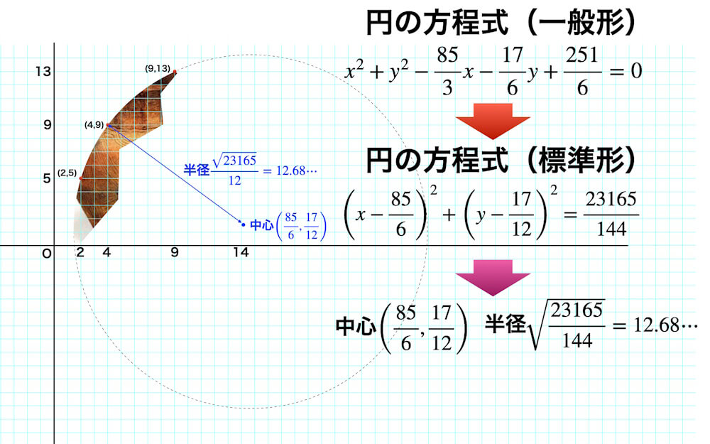 はたして、中心(85/6, 17/12)、半径r=12.68…が得られます。この結果を座標に反映してみると3点を通る円周が浮かび上がります。