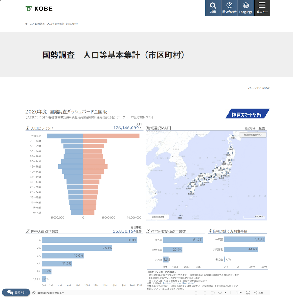 神戸市の「神戸データラボ」では、全国の国勢調査データをグラフや地図で可視化したダッシュボードを提供している。