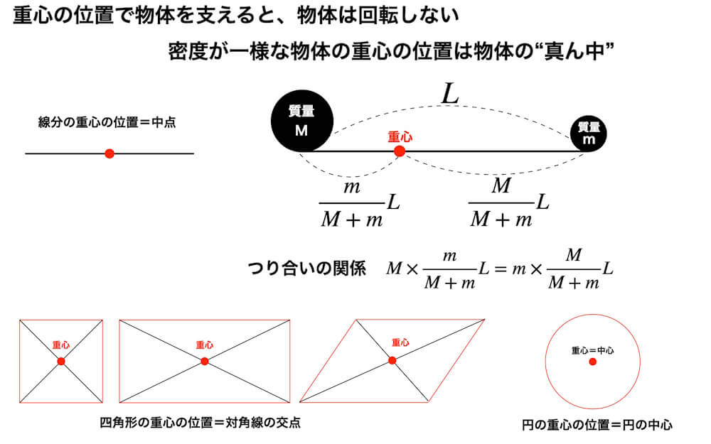 これが"つり合う"ということです。シーソー台がつり合う支点の位置が重心です。重心で物体を支えるとその物体は回転しません。物体をその1点のみで支えることができる点という意味で、重さの中心すなわち重心(center of gravity)と呼ばれます。