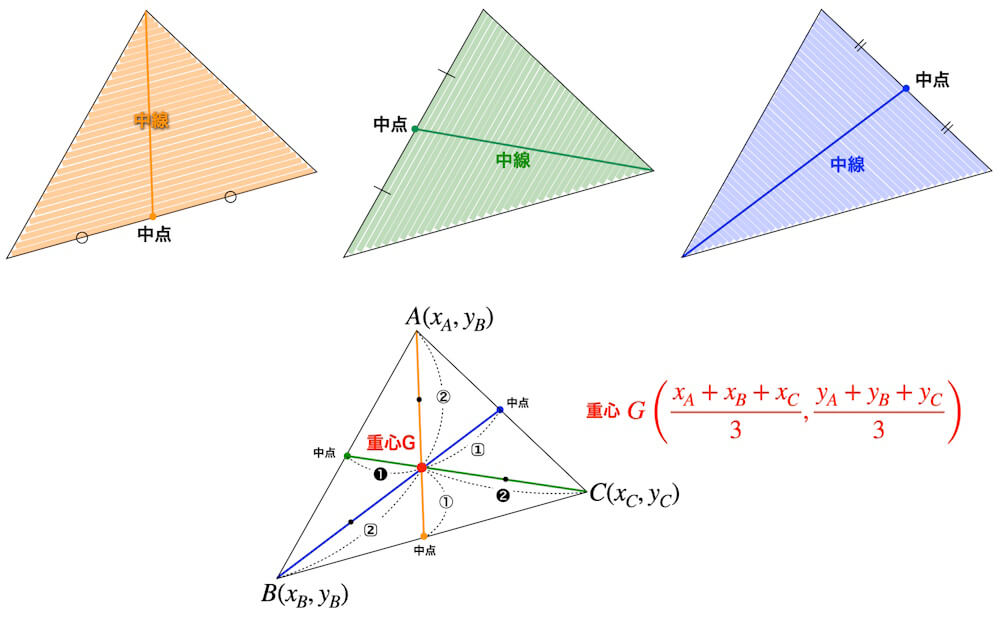 三角形を座標平面上で考えると三角形の重心の座標はx座標、y座標はそれぞれ3頂点のx座標、y座標の相加平均(3つの和の3分の1)で与えられます。