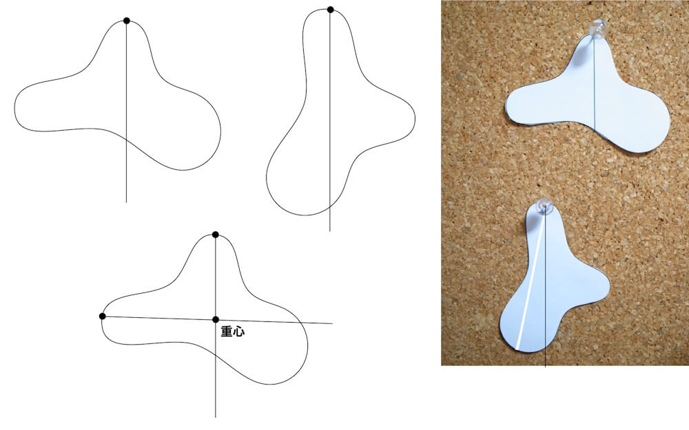 実際には、写真を撮って画像データ上に垂線を引く方法が効率的です。パソコンの画面上で重心を求めることができます。