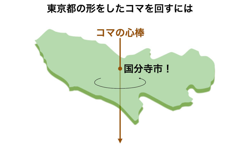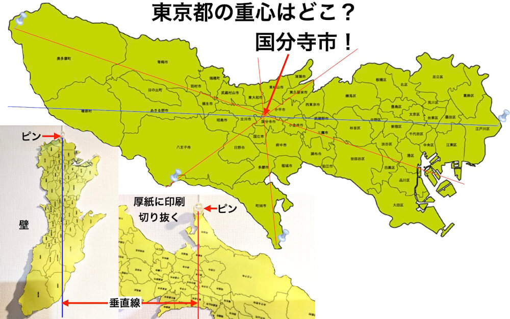 これと同じ方法で東京都の地図の重心を探してみると、国分寺市が重心の位置であることがわかりました。検索してみると、国分寺市の公式ホームページに国分寺市が東京の重心だと載っていました。