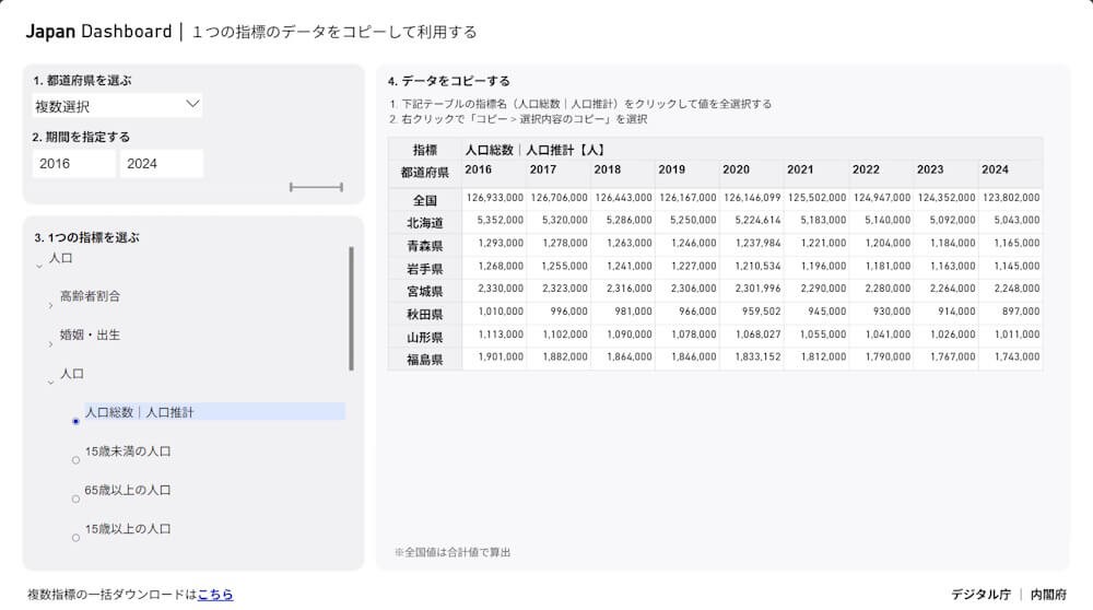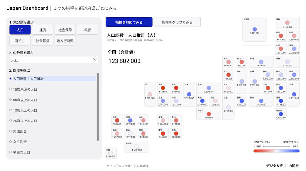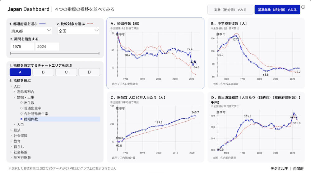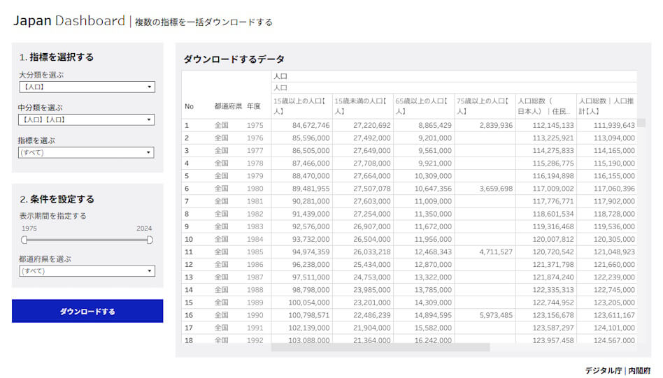 内閣府とデジタル庁は、データに基づく政策立案を推進するため、新たに「Japan Dashboard(経済・財政・人口と暮らしに関するダッシュボード)」およびデータカタログを整備し、2025年7月10日に公開した。