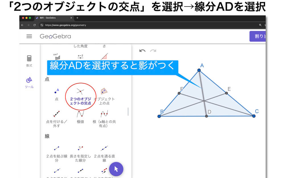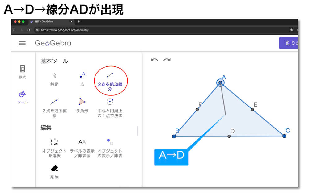 線分ADを選択すると、線分ADに影がついて選択されたことが確認できます。