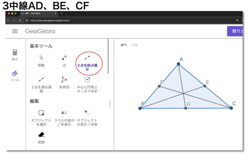 3中線が作図できたら、2中線ADとBEの交点を作図します。