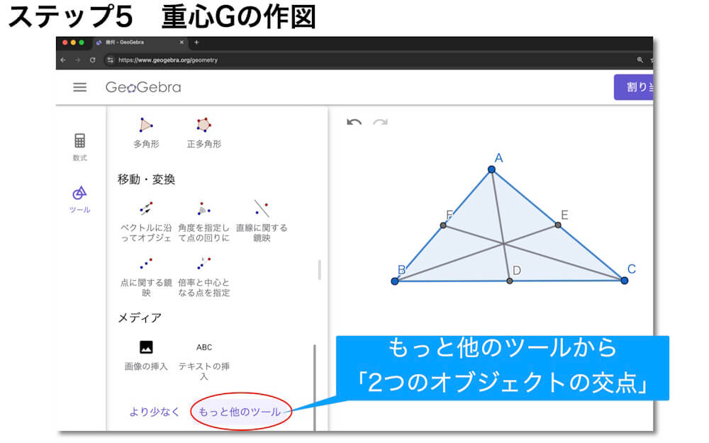 以上で重心の作図が完了。最後は三角形を変形して2中線の交点Gが3中線の交点であることを確認します。