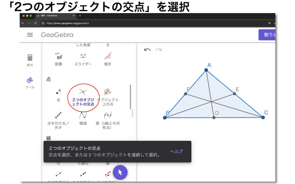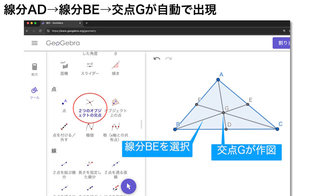 続けて線分BE を選択します。2線分の交点がGとして作図されます。