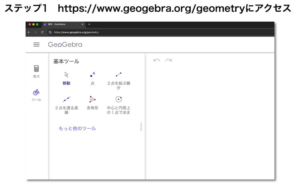 https://www.geogebra.org/geometryにアクセスすると「幾何」アプリの画面が開きます。