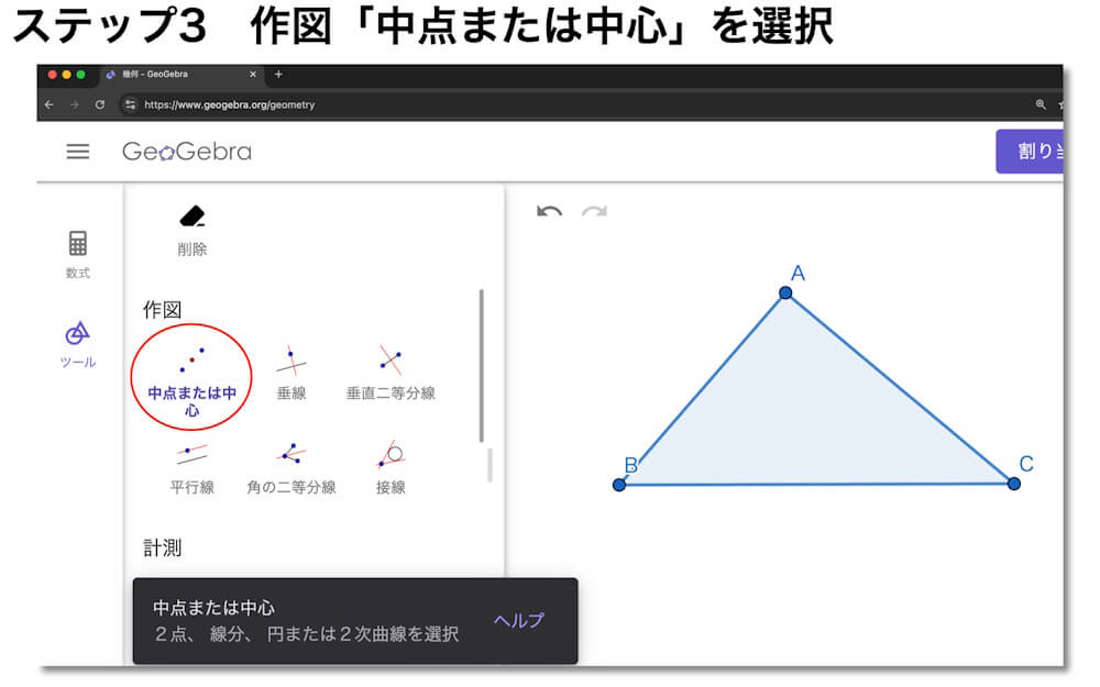 作図の中に「中点または中心」が見つかります。それを選択すると、ヘルプに「2点、線分、円または2次曲線を選択」と表示されます。