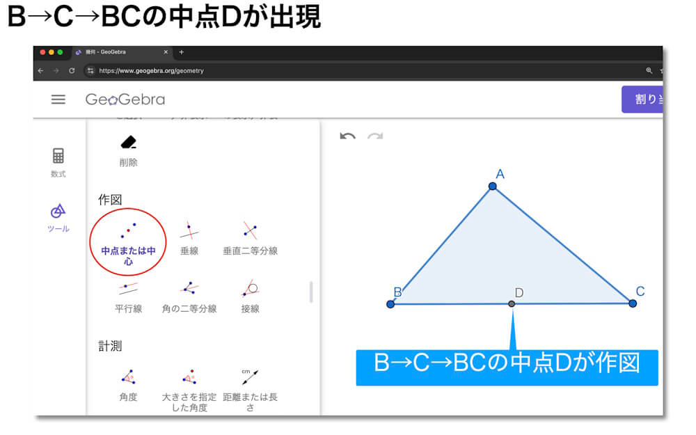 線分BCの中点を作図するために2点B、Cを選択すると、中点がDとして出現します。