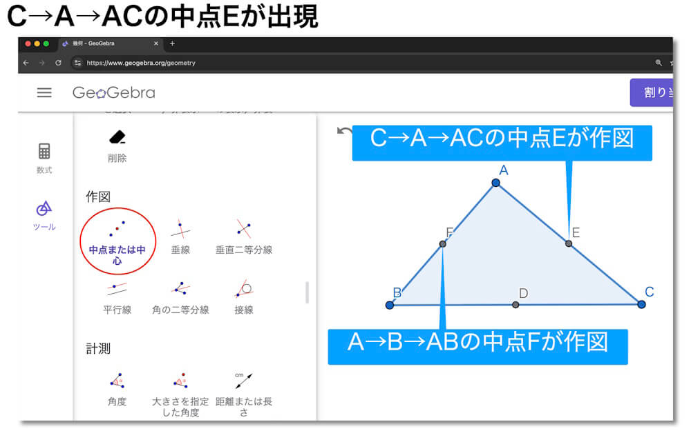 線分AC、線分ABについても、同様に2点を選択して中点を作図します。