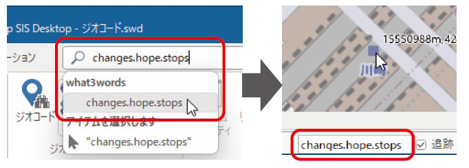 SISでは、リボンの検索ボックスに3語を入力して表示されるwhat3wordsの候補をクリックすると、該当位置に表示範囲が移動します(図1)。