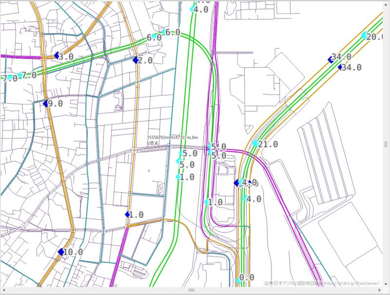 高速道路や一般国道の距離標を表示して他の地図と重ね合わせると、道路上の位置特定などに利用できます(図10)。
