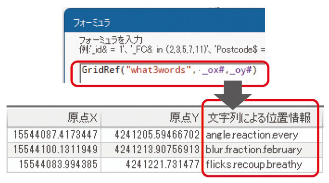 逆に、図形の位置情報からwhat3wordsの位置情報文字列を取得する場合は、GridRef関数を使用します(図6)。