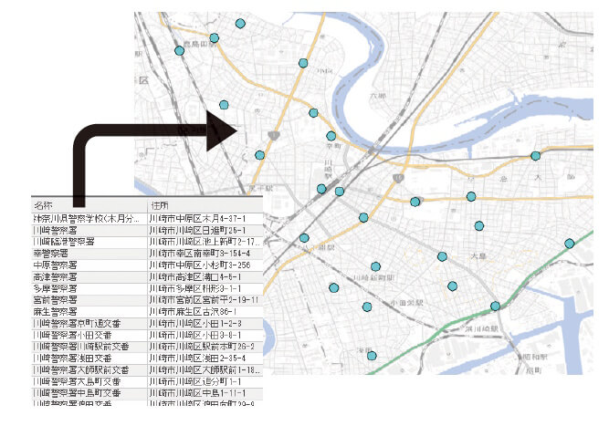 ジオコードを使うと、お手元の住所情報を持つ台帳から一括で地図上に座標をプロットし、手間なく連携できます(図8)。新たなデータ活用手段としてぜひお試しください。