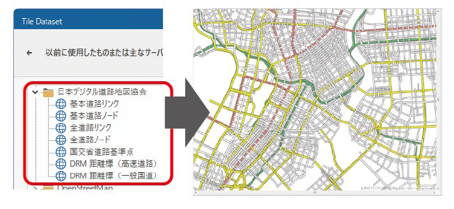 SISは地理院タイルをはじめ、Web配信の各種地図データを読み込めます。SIS 9.1 SR2では、Tile Datasetに登録した地図配信サービス一覧に、日本デジタル道路地図協会のデータが追加されました(図9)。